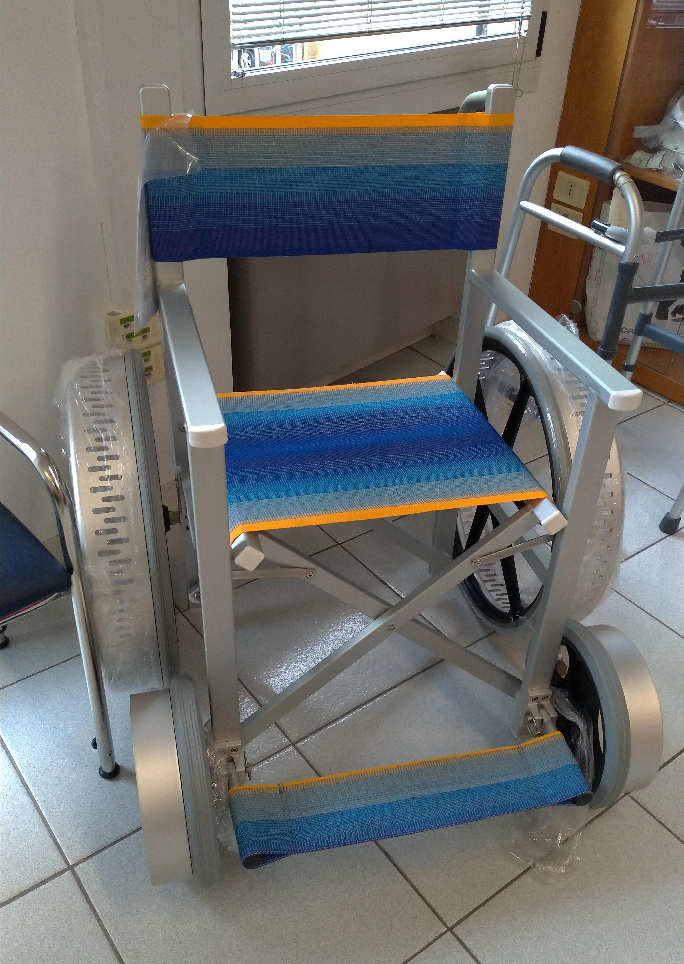 Carrozzina da spiaggia a 4 ruote ideale per lo spostamento sulla sabbia e per il bagno in mare con l’aiuto di un accompagnatore.