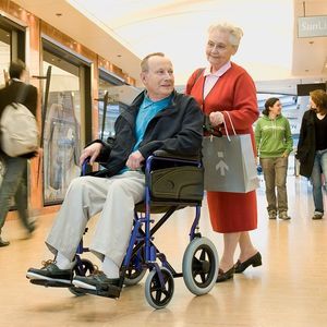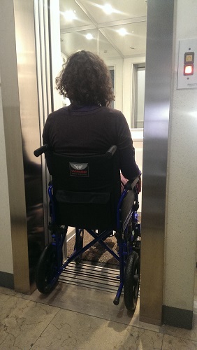 N.B. una carrozzina da transito per anziani e disabili, necessita di accompagnatore che spinga la carrozzella, perché dotata di ruote piccole e quindi non si riesce a spingerla autonomamente (vedi foto). Il vantaggio è che permette, grazie all'ingombro minimo delle ruote, di entrare comodamente in ascensore, porte strette, corridoi e bagni (vedi foto).