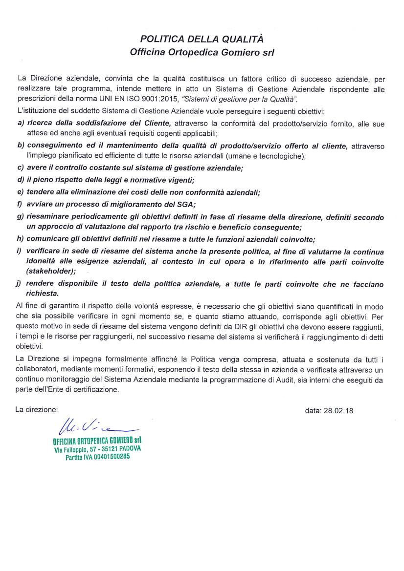 L'Officina Ortopedica Gomiero, con 103 anni di esperienza nella tecnica ortopedica, produce e commercializza un'ampia gamma di prodotti: tutori per lo sportivo, ginocchiere, plantari e scarpe su misura, maschere protettive in fibra di carbonio, busti contenitivi e corsetteria, protesi e tutori di arto, carrozzelle, deambulatori, ausili per anziani e disabili, articoli medicali e elettromedicali.
