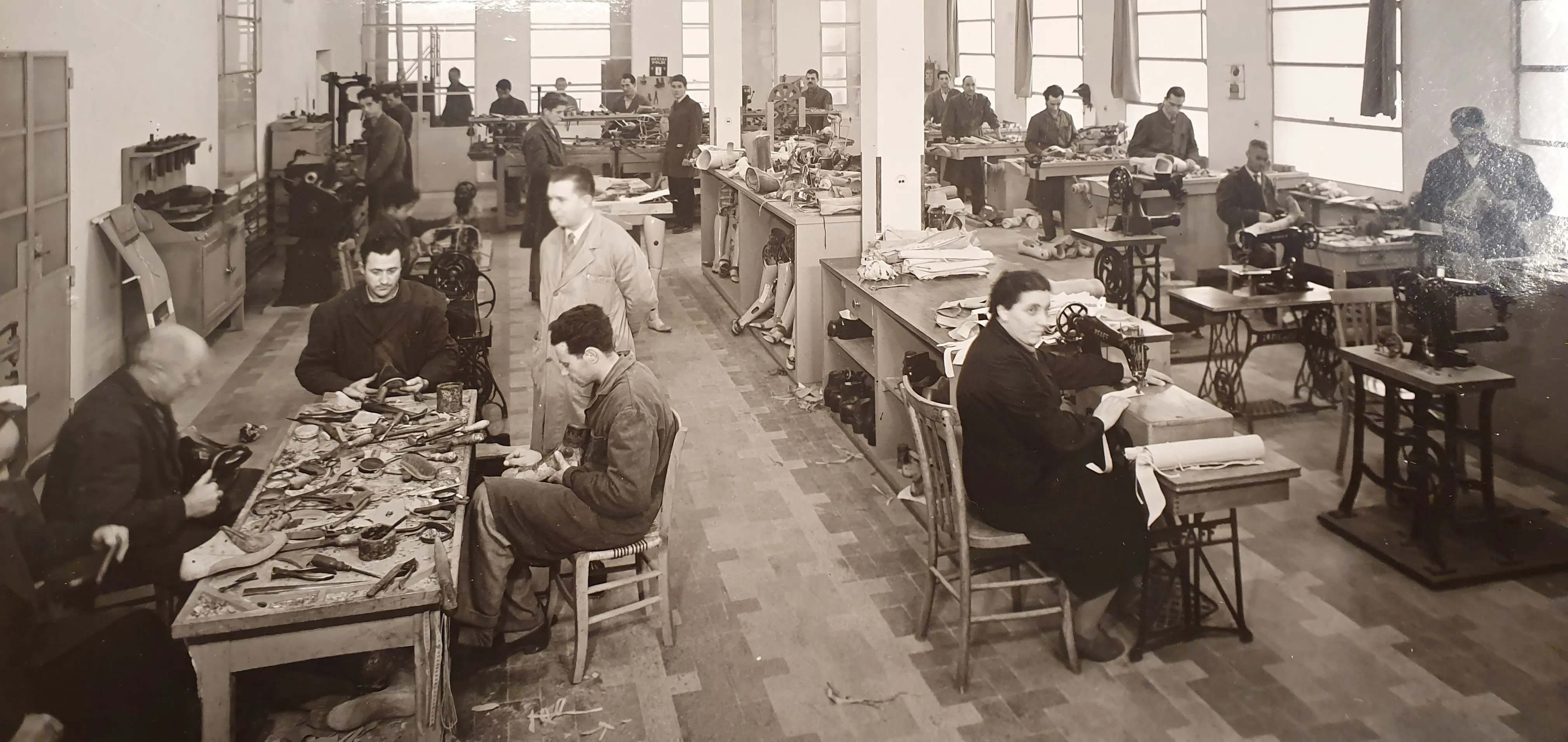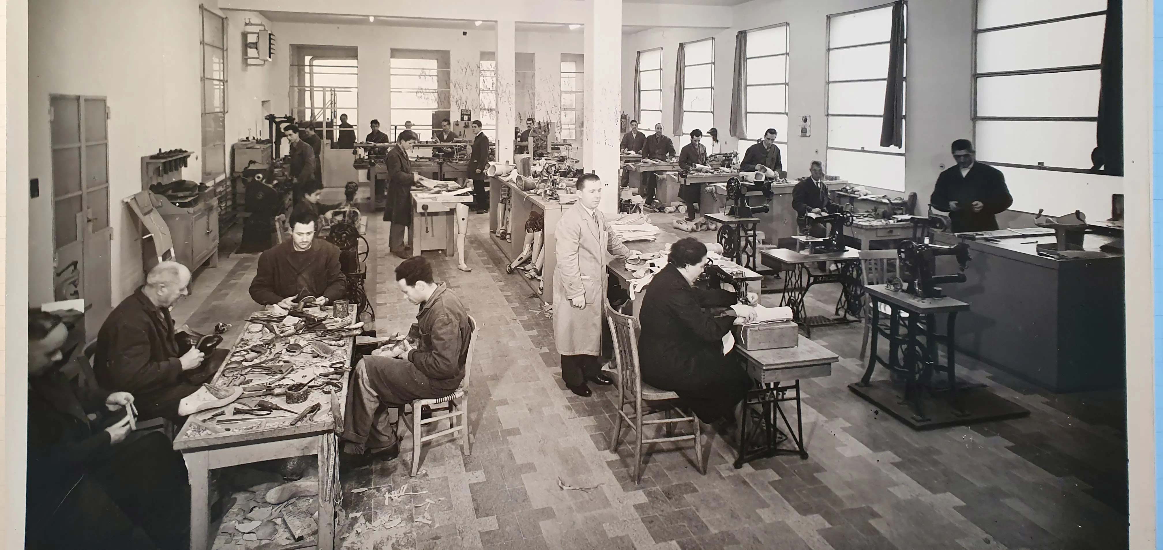 Visibili i fondatori: Pierina (alla cucitrice) e Gaetano Gomiero (in piedi in camice chiaro)