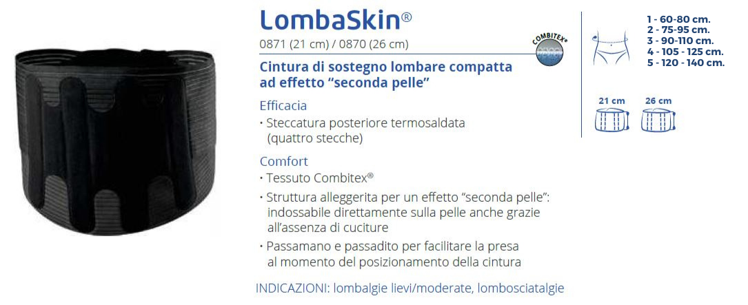 Cintura lombare areata in tessuto combitex, composta da quattro stecche posteriori e due anteriori, leggera e senza cuciture a contatto con la pelle, disegnata per la sua leggerezza e adattamento morfologico. Ingombro minimo e ottima tenuta.
