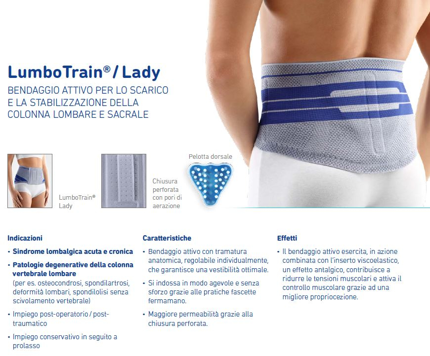 Busto per lo scarico e la stabilizzazione della colonna lombare e sacrale, a bendaggio attivo che esercita in azione combinata con la pelotta viscoelastica, un effetto antalgico riducendo tensioni muscolari.