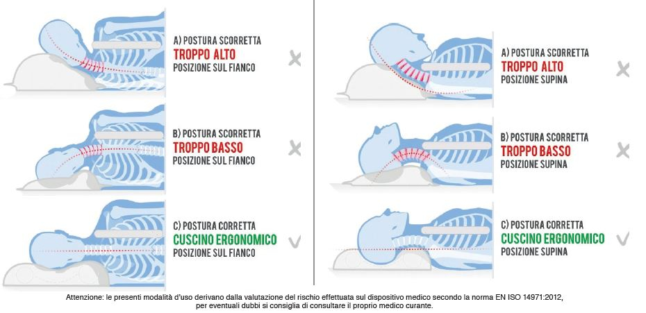 Il guanciale ortopedico in Memory foam ergonomico Anatomico Sleepway è un “Dispositivo Medico di classe 1- CE”, agevola una postura corretta del collo durante il riposo, favorendo il ridursi di fastidiosi dolori al risveglio. In questo modo il rachide cervicale rimane allineato in posizione naturale durante tutto l'arco del sonno (v. disegno). Traspirante, termoregolatore, antiacaro con federa anallergica lavabile.