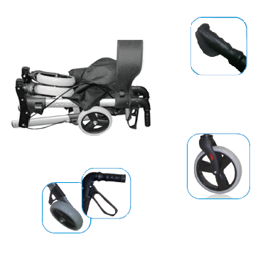 È dotato di ruote anteriori piroettanti con diametro da 20cm. e posteriori fisse da 17cm. Questa composizione particolare permette di superare agevolmente e con sicurezza gli ostacoli più frequenti che si possono incontrare come marciapiedi, cordoli e superfici sconnesse. Le ruote sono "piene" cioè prive di manutenzione e esenti da foratura (v. foto)