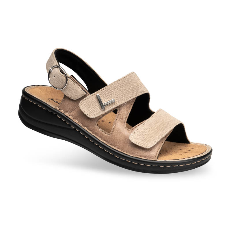 La tomaia automodellante e senza cuciture nelle zone di sfregamento si plasmarsi alla forma del piede, accogliendo comodamente eventuali deformità come alluce valgo o dita a martello, evitando pericolose e dolorose frizioni, donando massimo confort anche in casi di borsiti, gotta e callosità. La chiusura a velcro consente di aprire completamente la parte anteriore del sandalo e di regolare il volume interno in base alla necessità (piedi gonfi o edematosi).